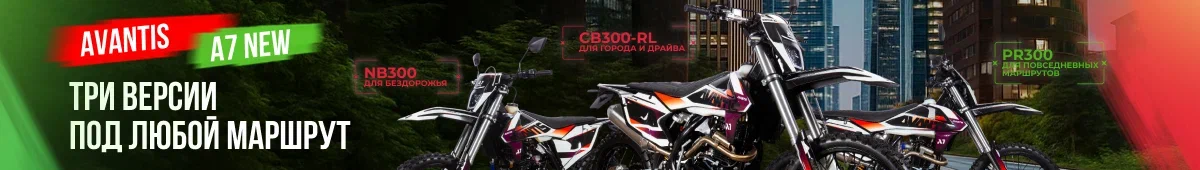 — Avantis A7 NEW CB300-RL с ПТС: 24 л.с., воздушное охлаждение, карбюратор Nibbi PWK 34. Идеален для динамичных заездов и смешанных маршрутов — от города до пересечёнки.